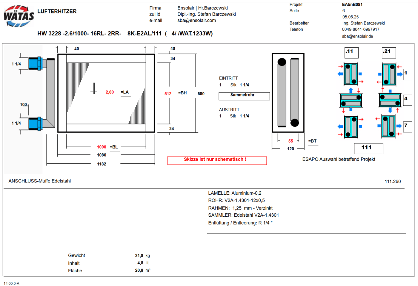 Bitte wählen Sie mit dem Schieberegler die gewünschte Luft-Eintritts-Temperatur und die gewünschten Vorlauf- und Rücklauf-Temperaturen des Wassers. Die Betriebsdatenblätter passen sich automatisch an. Die hier gezeigten Betriebspunkte sind beispielhaft gewählt.